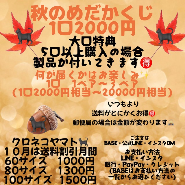 秋のめだかくじ 1口 2000円 5口以上ご購入の方には特典あり(内容は届いてからのお楽しみです) 1口につき 2000円〜20000円相当 【ヤマト割引月間】 ヤマト運輸 限定発送 60サイズ 1000円 80サイズ 1300円 100サイズ 1500円 ※通常より500円お得 BASEでのご注文は50口限定で受付終了となります。