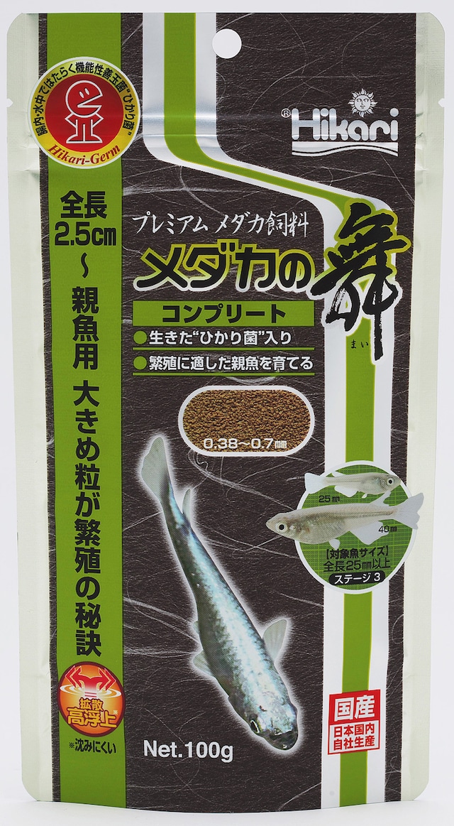 全長2.5cm~親魚用大きめ粒が繁殖の秘訣 生きた“ひかり菌”入り。繁殖に適した親魚を育てるプレミアムフード。 「メダカの舞」は、愛好家に向けてメダカのより早い成長、より多い繁殖数を目指して開発した高嗜好性プレミアム飼料です。 コンプリート:全長約2.5cmにまで成長した若いメダカをしっかりとした体型の親魚へ成長させ、繁殖力をつけることを目的とした栄養価の高い飼料です。 水温に合わせ、1回2~3分で食べきれる量を1日に数回しっかりと与えてください。 オキアミミール、フィッシュミール、卵白粉末、イカミール、ビール酵母、魚油、でんぷん類、乳化剤、グルテンミール、大豆ミール、海藻粉末、酵母エキス、アミノ酸(メチオニン)、タウリン、生菌剤、スピルリナ、カロチノイド、粘結剤(ポリアクリル酸Na)、ガーリック、ビタミン類(塩化コリン,E,C,イノシトール,B5,B2,A,B1,B6,B3,葉酸,D3,ビオチン)、ミネラル類(P,Ca,Si,Fe,Mg,Zn,Mn,Cu,I) 内容量:100g 税抜価格:1,380円→966円(30%OFF) JANコード:4971618-204332